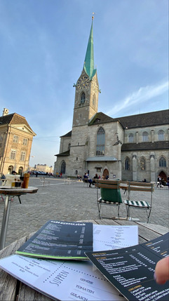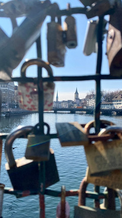 (Left) Views from the Lindenhof viewpoint, (Centre Left) Mühlsteg Bridge, (Centre Right) On top of Grossmünster, (Right) Along the promenade of the Limmat River