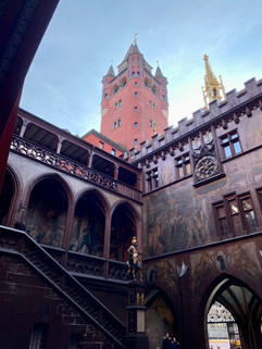 (Left) Basel Rathaus City Hall, (Centre Left) exploring the streets of Basel, (Centre Right) the Spalentor Gate, (right) lunch along the Rhine River
